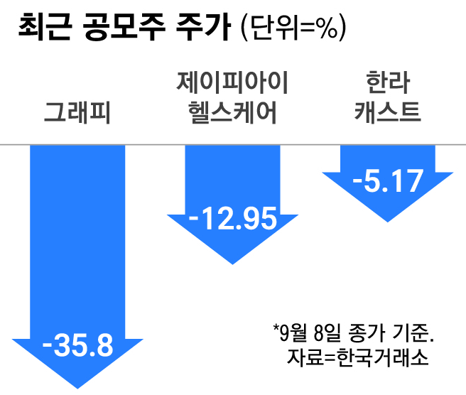 지난달 25일 코스닥에 상장한 그래피는 상장 첫날부터 공모가를 회복하지 못하고 결국 공모가 대비 35.8%나 하락한 상태예요. 그래피뿐만 아니라, 그 직전에 상장했던 제이피아이헬스케어나 한라캐스트도 상장 초반의 반짝 상승세를 이어가지 못하고 지금은 모두 공모가를 밑돌고 있답니다.