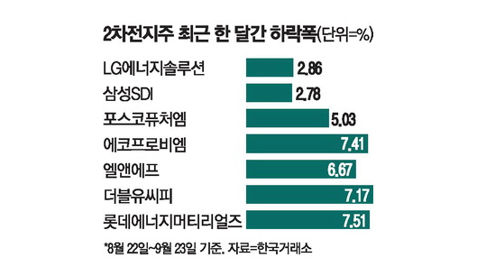 여기서 LG화학이나 SKC처럼 오른 종목도 있었는데, 이들은 2차전지보다는 화학이나 반도체 같은 다른 사업 부문에 대한 기대감으로 주가가 오른 경우였습니다. 결국 KRX 2차전지 TOP 10 지수는 전체적으로 3.38%나 하락했더군요.